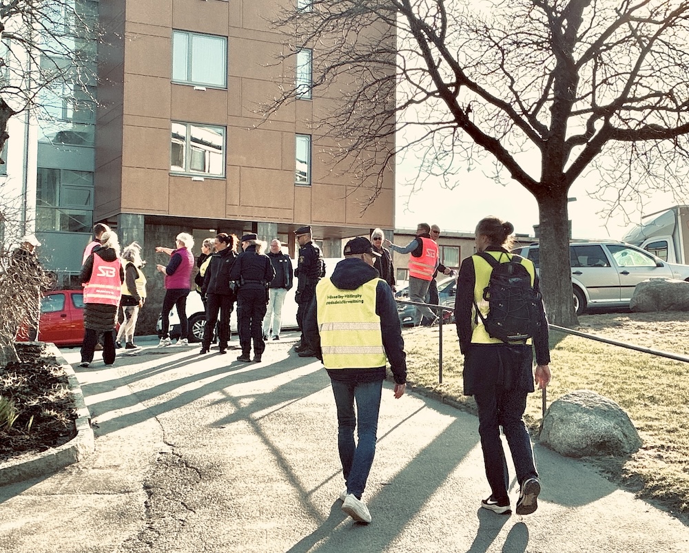 Om detta visste vi inget när vi kvällen innan (14/4) samlades för trygghetsvandring på samma torg och sedan gick tillsammans och inventerade vår planerade rutt genom Hässelby strand. Som vanligt en glad och brokig skara deltagare i olika åldrar – medborgare blandat med representanter för stadsdelsförvaltningen, polisen, Trafikkontoret, Svenska Bostäder, lokala bostadsrättsföreningar, den lokala Hyresgästföreningen och Hässelby-Vällingby Fastighetsägare.